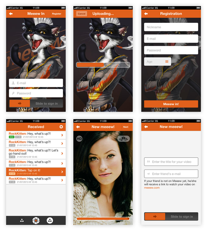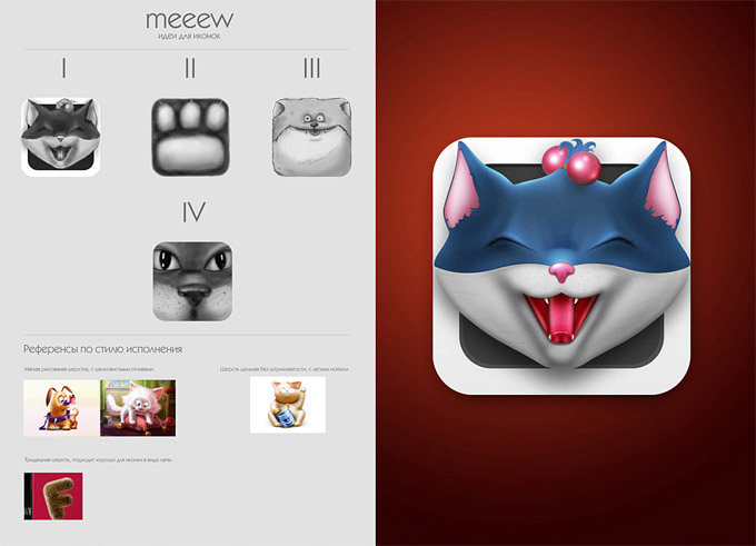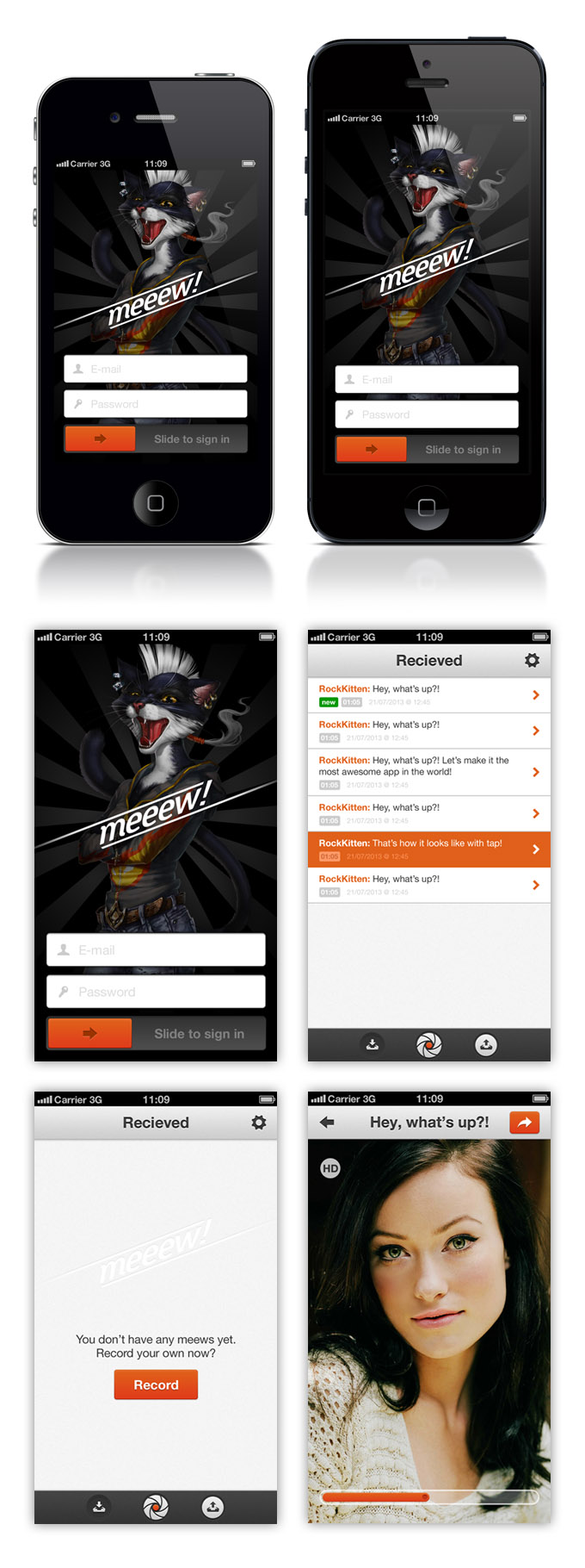 С чего начинается любое приложение? Конечно, с концепта, названия и иконки. Название и концепция придумалась сразу. Мяу – потому что забавно и метко. Как еще назвать быстрое и спонтанное видео, которое посылает тебе, например, твоя девушка? ;-) Так нейминг стал доменом и основной идеей, заодно сразу дав отправную точку для всех изображений и иконки.