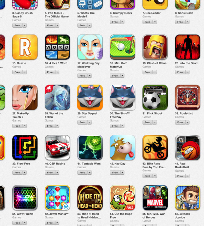 А вот дизайнер демонстрирует как сильно выделяется эта прекрасная иконка из визуального ряда топа App Store. Блескота! (Справедливости ради, иконка воистину выделяется.)