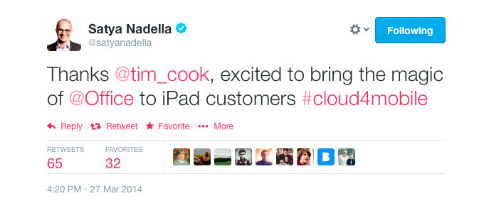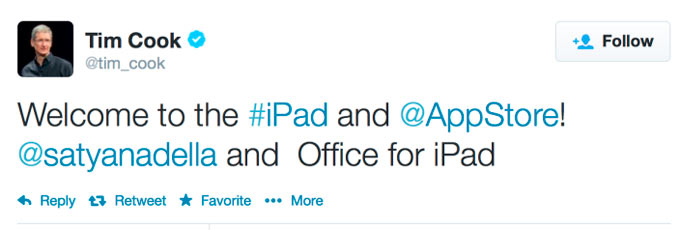 Тима Кука трудно назвать пользователем Twitter со стажем, однако глава Apple не пропускает ни одного значимого для Apple события после регистрации в социальной сети. Вот и дебют Microsoft Office для iPad стал поводом для нового твита.