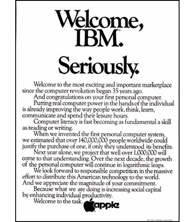 Подобный обмен любезностями может свидетельствовать как о потеплении отношений между конкурирующими компаниями, так и тонкой иронии, которую Apple уже использовала против конкурентов в прошлом. Достаточно вспомнить открытое послание Apple компании IBM, приветствующее выход последней на рынок персональных компьютеров.