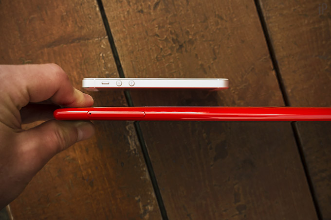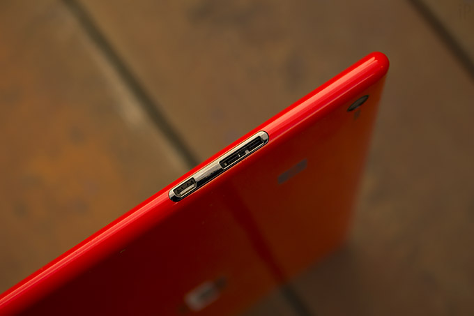 Дисплей хорош, но задняя панель ещё лучше. Столь яркий, невероятно глянцевый (да-да) гаджет смотрится вызывающе в век строгого алюминия и кроткого матового пластика. Игра света на корпусе устройства из качественного глянцевого пластика – явно один из факторов, который заставил Джонатана Айва утвердить выпуск iPhone 5c. На открытом воздухе в солнечную погоду (и даже в пасмурную), Lumia 2520 выглядит здорово. Минимализм в элементах управления и внешних портах этому только способствует. Единственный минус глянцевого корпуса – в том, как он притягивает отпечатки пальцев. Протирать устройство приходится регулярно. В этом плане белая модель будет предпочтительнее, чем чёрная или та же красная.