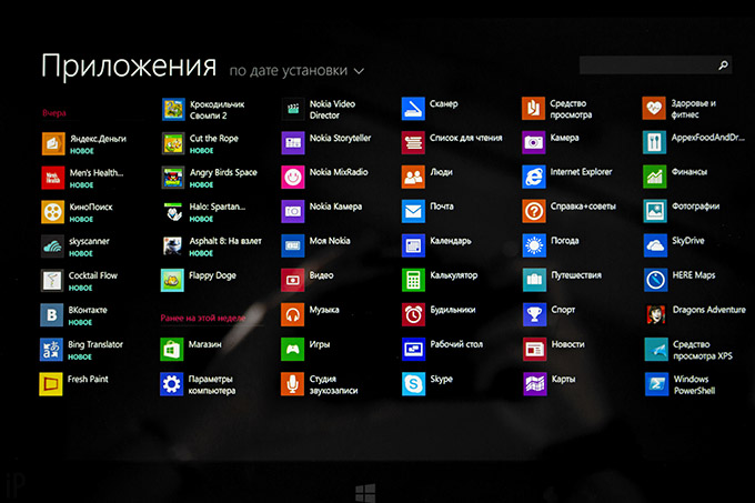 К примеру, для открытия предыдущей программы нужно потянуть пальцем от левого края дисплея к правому. Все подобные действия сопровождаются простой, но максимально плавной анимацией. Это известный конёк Windows Phone, и в Windows RT (как и в обычной Windows 8) с отзывчивостью интерфейса всё ничуть не хуже. С другой стороны, многие жесты интуитивно непонятны пользователю iOS с большим стажем. Полный выход из открытой программы осуществляется свайпом вниз от верхнего края экрана. А если приложение просто нужно скрыть, то на середине предыдущего жеста нужно остановиться и, не отпуская палец, подвинуть уже уменьшенное изображение окна к левому краю. Выходить из программ в меню «Пуск» также можно, нажимая на кнопку-логотип Windows. А переход к частоиспользуемым задачам, вроде поиска сетей Wi-Fi, осуществляется через меню «Charms bar», доступное при свайпе справа налево от правого края.