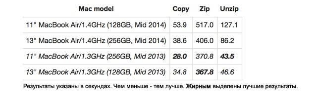 Таким образом, MacBook Air 2014 года выпуска справляется с копированием файлов на 35% хуже, чем модель прошлого года с такой же емкостью SSD. При извлечении архива разница составляет уже 53%, увы, не в пользу новинки.