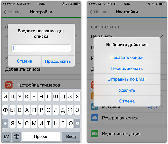 Все делается легко и непринужденно, но все-таки необходимо привыкать к работе системы жестов. При горизонтальном свайпе на элементе списка смена действия (таймер/перенос элемента и отметить как выполненный/удалить) происходит довольно быстро, менее чем за секунду. Из-за этого я пару раз удалил элемент вместо того, чтобы отметить его как выполненный.