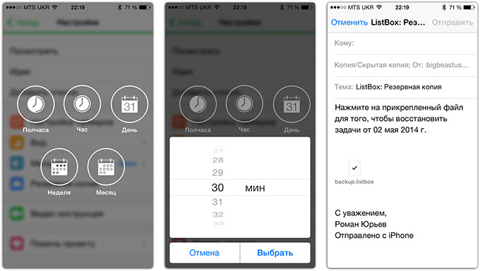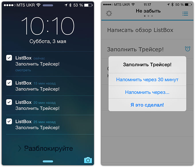 Кроме того, у приложения весьма назойливая система напоминаний, что в данном случае является плюсом. С помощью таймера вы указываете, в каком интервале присылать Push-уведомления (каждые 30–40 минут, каждый час и т. п.), но если его не заметили, то через пять минут придет еще одно напоминание со звуковым уведомлением. Снова оно прошло мимо вас? Ловите еще одно через пять минут, затем пару через каждые 10 минут и еще два через каждые 15 минут. Такую атаку напоминаний не заметить сложно. Когда же вы прореагируете на Push-уведомление то появится диалог предлагающий отметить задание как выполненное, либо напомнить о нем позже.