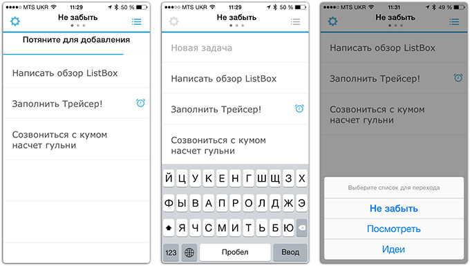 Что ж, переходим непосредственно к спискам задач. Для добавления нового элемента в список, достаточно сделать свайп сверху вниз. Переключение же между списками осуществляется горизонтальным свайпом в верхней области, либо тапом по ней и выбором нужного в появившемся меню.