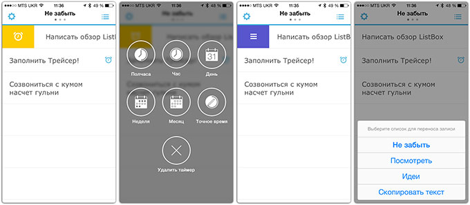 Пара жестов используется и для работы с отдельными элементами списка. Если потянуть задачу слева направо тогда можно установить таймер. Сделайте тот же жест, но немного подержите палец на экране, не убирая в конце, и появится диалог переноса элемента в другой список или же можно просто скопировать текст (стандартные системные функции копирования/вставки тоже работают):