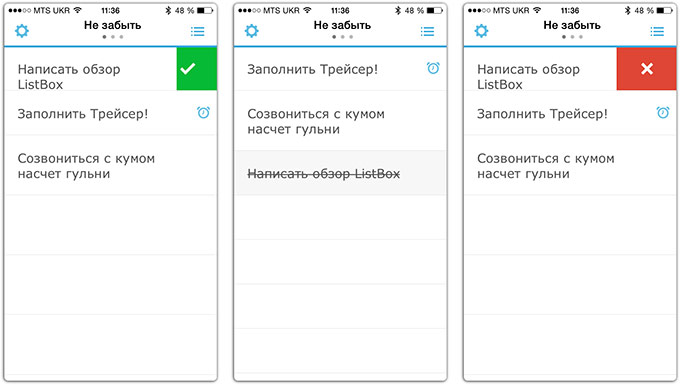 Потяните элемент списка справа налево и таким жестом вы отметите его как выполненный. Тот же маневр, но с задержкой пальца позволит удалить ненужную часть списка.