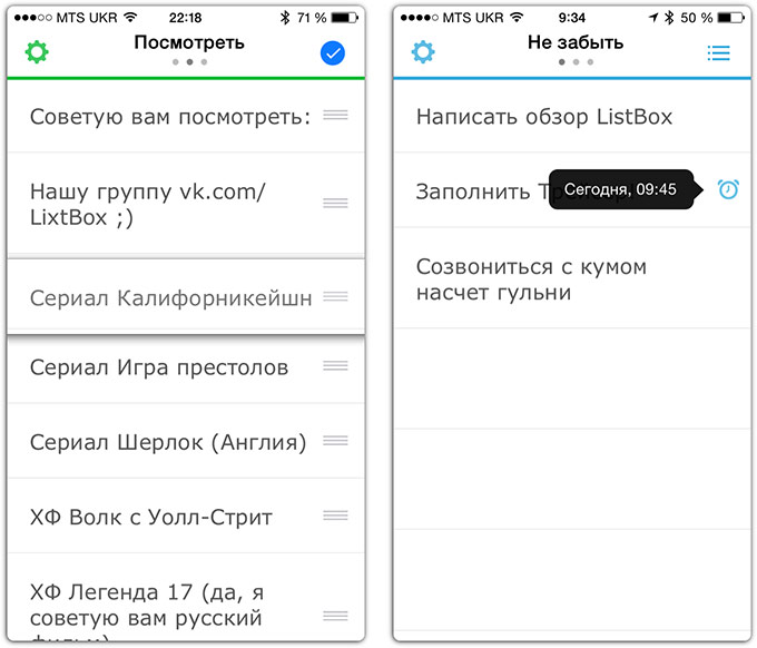 Элементы внутри списка можно легко менять местами, нажав на соответствующую иконку в верхнем правом углу, а если вам нужно узнать, на какое время установлено напоминание о задаче, тогда просто тапните по иконке будильника рядом с ней.