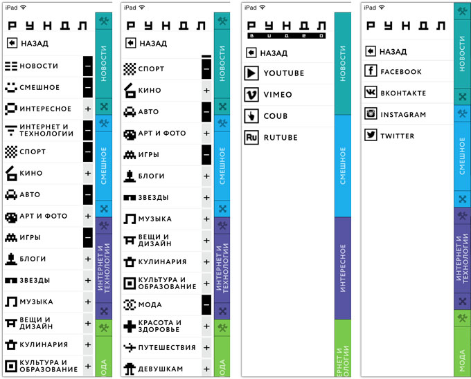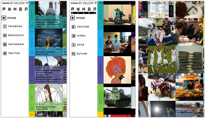 Но категории новостей это не единственный источник контента в РУНДЛ. Кроме так называемых течений доступны еще три раздела: социальные сети, видео и фотостена. Первый раздел выступает в роли агрегатора новостных лент для четырех социальных сетей: ВКонтакте, Facebook, Twitter и Instagram. Вводим свои учетные данные и получаем прямую трансляцию новостной ленты в РУНДЛ. В разделе видео доступны YouTube, Rutube, Vimeo и Coub. Видеозаписи также разделены на категории, аналогичные течениям.