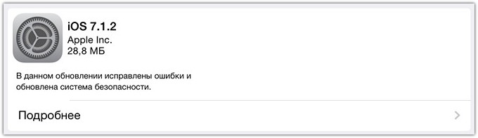 Чтобы установить iOS 7.1.2, достаточно подключиться к быстрому и безлимитному Wi-Fi, а затем открыть на устройстве Настройки -> Основные -> Обновление ПО. Прошивка также доступна для скачивания через iTunes для PC и Mac. Как всегда, в новой iOS может быть гораздо больше изменений, чем в официальном объявлении. Если вы нашли что-то новенькое, делитесь с нами в комментариях к этой статье.