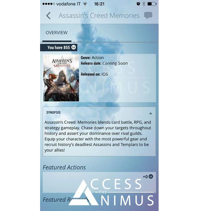 Вчера на форуме ресурса TouchArcade был опубликован скриншот фирменного приложения Uplay от Ubisoft. На нем запечатлена информация об игре Assassin’s Creed Memories, релиз которой обозначен, как «скоро», а в качестве платформы указана iOS. Игра еще не была официально анонсирована, и данный скриншот Uplay является единственным подтверждением не только ее скорого выхода, но и существования вообще.