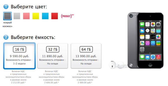 В российском Apple Online Store новый iPod touch с объемом памяти 16 ГБ доступен по цене 9590 руб. Однако на складе плеера еще нет, а срок доставки составляет от недели до двух. Модели iPod touch с объемом памяти 32 и 64 ГБ доступны в свободной продаже и присутствуют на складе магазина Apple по цене 11890 руб. и 13990 руб. соответственно.