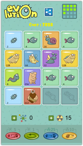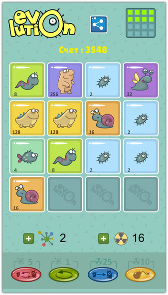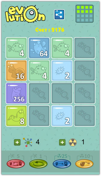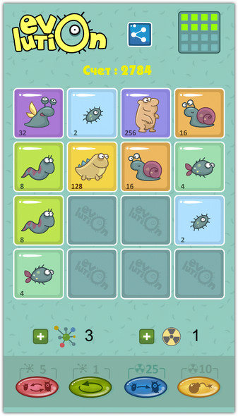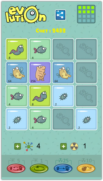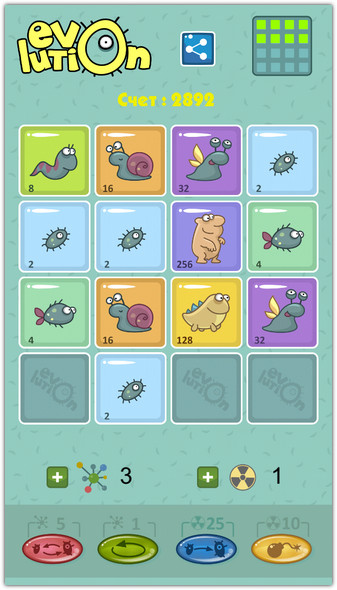 Если два одинаковых организма касаются друг друга по направлению перемещения, на их месте образуется новый. Это и есть «эволюция», обозначенная в названии приложения. Не стоит пугаться якобы новых механик: идея с клеточными организмами не влияет на прохождение. Каждому существу-плитке назначена своя чётная цифра, что позволяет опытным игрокам из 2048 очень быстро почувствовать себя как дома. В главном меню даже есть настройка, скрывающая большую часть графики на платформах и оставляющая большие, заметные издалека числа.