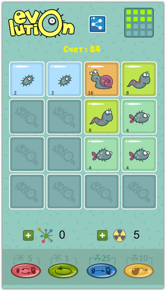 Помимо основных действий, игрок может воспользоваться дополнительными способностями. Всего их четыре. Самая очевидная и простая – возможность отменить ход. Если вам необходимо найти пару для существа, можно воспользоваться способностью, удваивающей уровень плитки без участия другой такой же. Есть вариант поменять местами эти самые плитки, используя соответствующую функцию. Наконец, если вы попали в особо сложную ситуацию, стоит применить «бомбу», удаляющую с поля самые молодые цифры-организмы. Все эти способности требуют энергии, которую вы «находите» в процессе прохождения, а также можете купить в магазине.