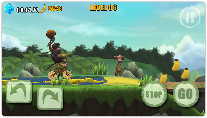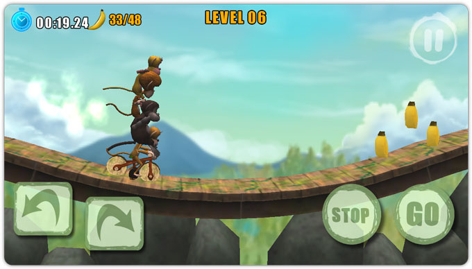 Зато привыкания потребует оригинальная модель утяжеления велосипеда. По ходу прохождения уровня на спину первой обезьяне буду забираться другие. Общее число приматов может достигать четырех особей на одном велосипеде. А теперь заметьте, что вся эта живая пирамида вырастает вверх, и представьте, как изменяется центр тяжести, точнее затрудняется управление им. Любой прыжок грозит стать фатальным, если не уследить на движением обезьян, решивших прокатиться сверху.