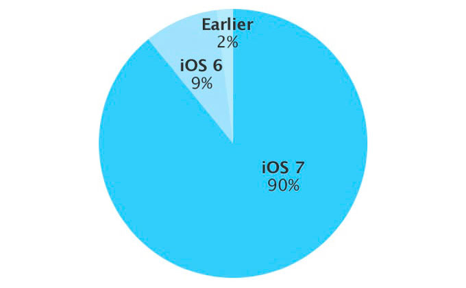 Данную информацию опубликовала сама Apple на странице поддержки разработчиков своего веб-сайта. За 10 месяцев, прошедшие с момента релиза iOS 7, мобильная операционная система распространилась на 90% смартфонов, планшетников и плееров Apple. Предыдущий пресс-релиз был опубликован в апреле, и тогда распространенность iOS 7 составляла 87%.