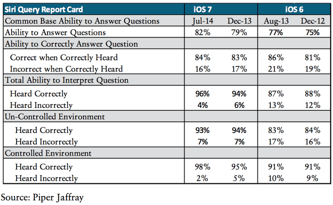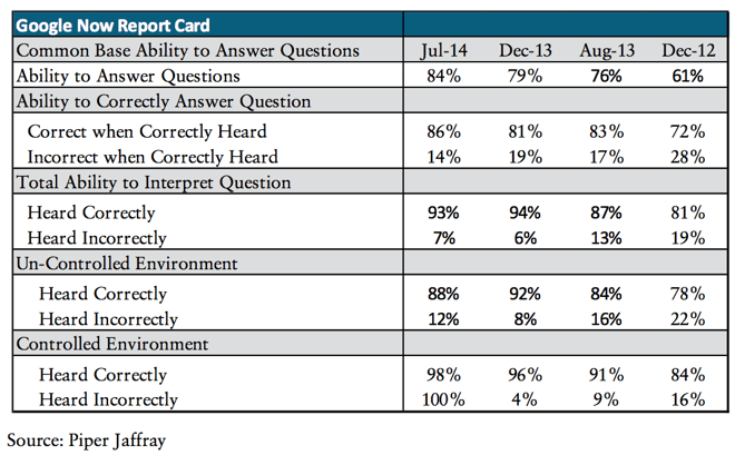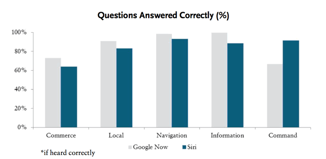Сегодня Siri определяет вопрос пользователя правильно в 96% случаев, а Google Now – в 93% ситуаций. Выросла и способность отвечать на те самые вопросы – до 82% у Siri и 84% у аналога Google. Улучшение эффективности механизма распознавания речи, лежащего в основе Google Now, оказалось существенным и во многом догнало нынешние достижения Apple в iOS 8. В итоге в сравнительной таблице вновь оказалась сухая статистика с противоборствующих лагерей, наложенная на результаты аналогичных тестов в 2013-м и 2012-м годах.