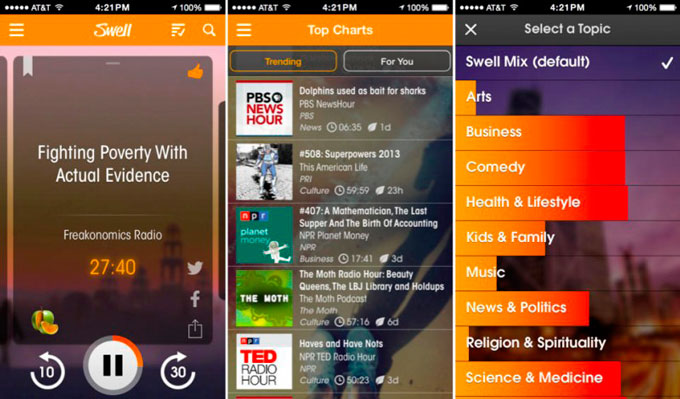 Сервис Swell позволяет персонализировать радиостанции для прослушивания новостей по тематикам, которые интересны пользователю. В рамках Swell доступны новости NPR, ABC, ESPN, BBC и многих других информационных каналов. Собственный потоковый сервис Apple iTunes Radio лишь недавно начал транслировать новости, поэтому покупка может быть очень полезна в перспективе. Также при помощи Swell можно слушать подкасты.
