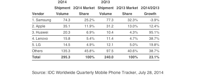 Однако все эти успехи двух лидеров в индустрии меркнут на фоне скачка, который продемонстрировали Huawei и Lenovo. Первая отгрузила 20,3 млн смартфонов (6,9%), а вторая 15,8 млн устройств (5,4%). Сами по себе числа не такие впечатляющие, если не принимать во внимание рост относительно второго квартала 2013 года. Для Huawei он составил 95,1%, а для Lenovo 38,7%. Также серьезно подтянулась LG, которая заняла пятую строчку по итогам второго квартала: 14,5 млн смартфонов, 4,9% поставок и рост в 19,8%.