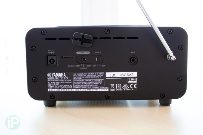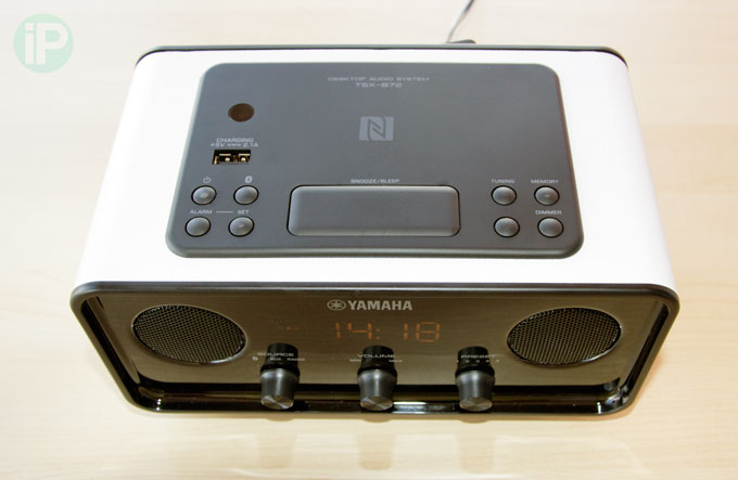 Также спереди нашлось место для небольшого дисплея, отображающего время, и трех олдскульных регуляторов. Первый переключает источник звука, второй изменяет громкость, а третий позволяет переключаться между радиостанциями, сохраненными в памяти. Звук может поступать в Yamaha TSX-B72 из трех источников: непосредственно радио, Bluetooth 2.1 + EDR и AUX. Пусть вам не смущает разъем USB сверху, он подходит для зарядки мобильного устройства, но не для подключения флеш-накопителя. Довольно странное решение.
