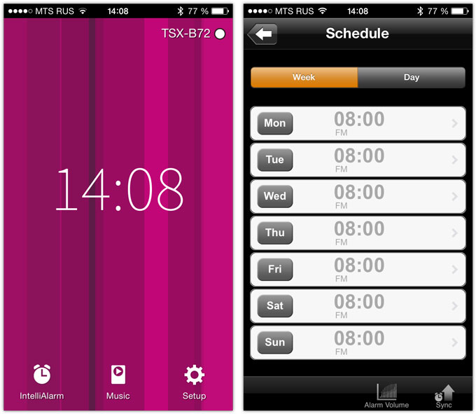 При помощи приложения пользователь волен устанавливать будильник на каждый день недели, а также присваивать каждом дню уникальную композицию для звонка. Отмечу, что настроить текущее время на Yamaha TSX-B72 тоже лучше при помощи приложения. Настройка времени вручную при помощи клавиш на устройстве и без предварительного ознакомления с инструкцией в 9 из 10 случаев обречена на провал. Эта особенность характерна для большей части продукции Yamaha с часами, хотя и не является чем-то критичным.