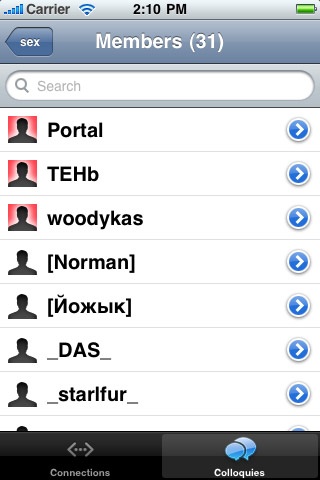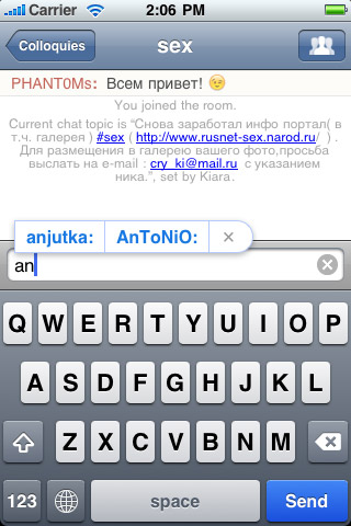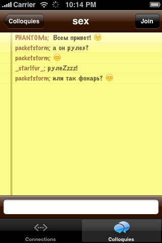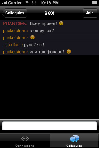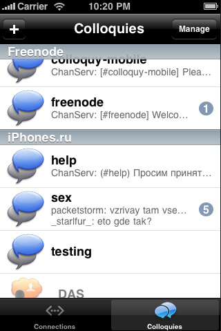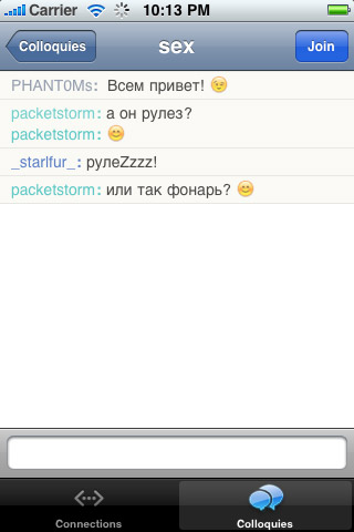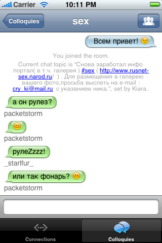 Colloquy это мобильная версия популярного IRC-клиента для Mac OS X, с очень приятным интерфейсом и широкими возможностями.