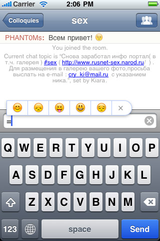Для любителей смайликов в Colloquy есть графические смайлики, они появляются в качестве подсказки, если написать один из символов (например, двоеточие или дефис). Каждому символу соответствует несколько смайликов.