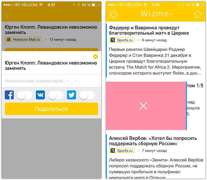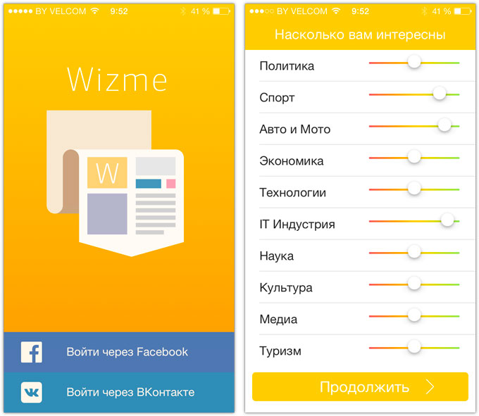Для использования Wizme потребуется наличие учетной записи социальных сетей ВКонтакте или Facebook. Других вариантов использования приложения нет, хотя логика подобного решения вполне понятна. Все-таки пользователями смартфонов и планшетников, а также подобных приложений-агрегаторов являются именно активные в социальных сетях люди. Отсюда и такое требование. Кроме того, наличие учетной записи будет полезно для хранения информации о предпочтениях пользователя, чтобы сделать новостную подборку более точной.