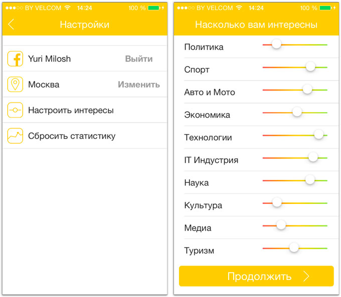 После ввода данных своей учетной записи потребуется определиться с предпочитаемыми темами. На выбор полтора десятка тем новостей: политика, спорт, авто и мото, экономика, технологии, IT-индустрия, наука, культура, медиа, туризм, светская хроника, здоровье, еда, недвижимость и из жизни – таковы информационные категории Wizme. Однако выбор тем происходит не посредством переключателя «Включено – Выключено», а при помощи удобных ползунков, которыми можно точно указать, насколько вам интересна та или иная тема. Допустим, вы не очень интересуетесь новостями политики, но хотите оставаться в курсе – просто перетяните ползунок влево, но не до конца и периодические политически сообщения вам обеспечены.