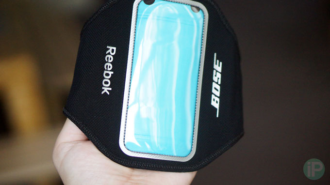 Чехол-повязка является результатом совместной работы Bose и Reebok и представляет собой вполне стандартное решение, которое, однако, очень редко встречается в комплекте поставки с гарнитурой, пусть даже и спортивной. Чехол представлен вполне стандартной конструкцией и рассчитан на iPhone 5/5s и, возможно, 5c. Отверстия под динамик, микрофон и разъем для подключения гарнитуры не предполагают защиту от влаги. Тем не менее, клапан, прикрывающий вставленный в чехол смартфон, прорезинен, а само устройство «сидит» внутри очень плотно. Также с обратной стороны предусмотрен кармашек для ключа или какой-либо тонкой мелочи.