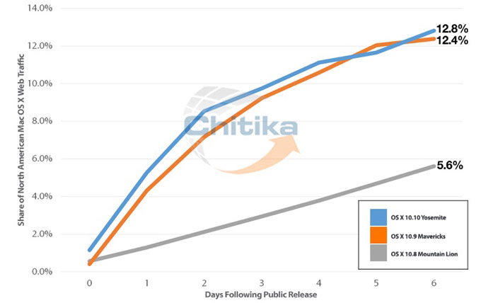 Аналитическая компания Chitika пристально следит за всеми крупными релизами программного обеспечения от Apple. OS X Yosemite не стала исключением. По состоянию на минувшую пятницу на последнюю версию операционной системы обновилось 12,8% пользователей компьютеров Mac. Это весьма неплохой результат по сравнению с Windows, но прорыва относительно Mavericks не случилось.