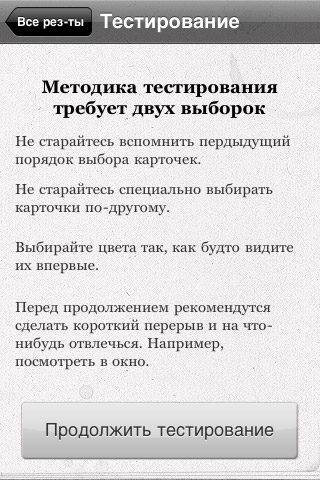 Приложение для iPhone iLuescher предельно просто в управлении. Запускаем программу, выбираем наиболее приятные в данный момент нам цвета (в порядке убывания). Потом выбираем еще раз и знакомимся с результатом вашего тестирования, который выражен в словах, описывающих актуальное эмоциональное состояние. Спорить с тестом или, не дай бог, с Люшером, говорить, что все это не правда и не про вас смысла нет, все доказано уже давно – тест работает. В целом по приложению никаких вопросов не возникает. Полезной для пользователей будет функция сохранения результатов с указанием времени прохождения. Откровенным минусом является разве что в два раза завышенная цена. Доллара, честно скажу, не жалко, а вот двух за минутный “fun” как-то, на мой взгляд, многовато.