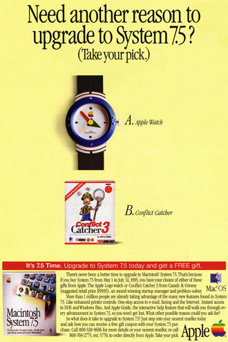 Итак, покупатели System 7.5 могли выбрать один из двух доступных подарков, одним из которых и были часы Apple Watch. Все возможности часов ограничивались демонстрацией текущего времени, зато их дизайн был выполнен как раз в стиле и фирменных цветах Apple тех лет.
