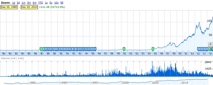 Динамика изменения рыночной стоимости акции Apple в период с декабря 1980 года по сегодняшний день