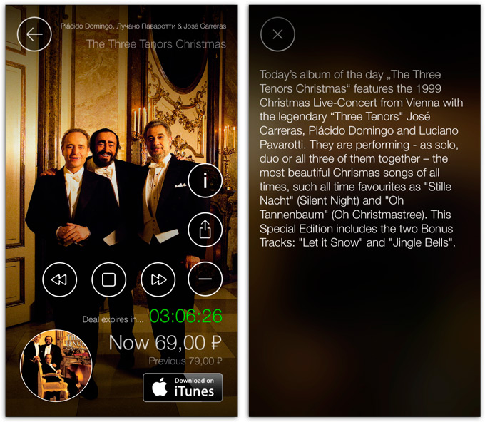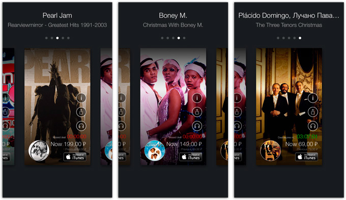 Интерфейс приложения предельно прост. Вы перемещаетесь между альбомами, которые были представлены со скидкой несколько дней назад, а также тем, который доступен по сниженной цене прямо сейчас. О любом альбоме можно получить подробную информацию, прослушать отрывки композиций из него и поделиться сведениями об акции с друзьями, которых также может заинтересовать уникальное предложение.