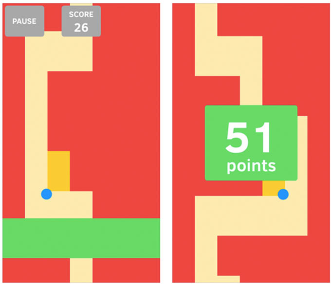 Перед нами скромная синяя точка, желтая дорога и красная граница. Задача – провести синюю точку как можно дальше. Для управления предусмотрена зеленая полоска. Доверьтесь интуиции и глазомеру.