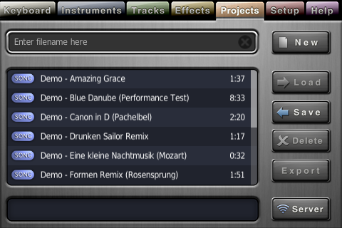 Приложение имеет 2 особенности. Во-первых, для создания полноценного музыкального произведения нам больше не понадобиться компьютер: на iPhone можно наиграть нарезки разными музыкальными инструментами, в закладке “Tracks” подредактировать все параметры мелодии. На конечном этапе производства музыкального шедевра можно поиграться эквалайзером и в меню “Projects” перекинуть потенциального лидера “MTV Music Awards 2010” на свой PC или Mac для дальнейшего редактирования и прослушивания. Последнее меню и является второй особенностью, так как позволяет не только передавать по Wi-Fi мелодии на компьютер, но и импортировать MIDI-мелодии прямо на iPhone.