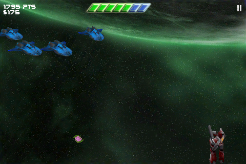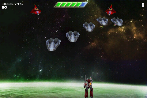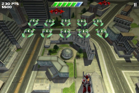После запуска игры перед наши глазами проигрывается довольно красивое видео с кучей летящих инопланетных кораблей и нашего героя-робота, который будет истреблять всю эту нечисть. Управлять роботом можно либо кнопками внизу экрана, либо же классическим методом – наклонами вашего iPhone. Стрелять в пришельцев, которые с каждым уровнем меняют свое обличие, придется с помощью тапания по экрану.