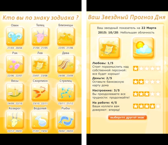 Необычно оформленный гороскоп разделён не только на знаки зодиака, но и на вкладки-советы по разным жизненным направлениям, будь-то кулинария, любовь или автолюбительство. Яркий интерфейс программы в игровой форме даёт советы тем, кто в них верит.