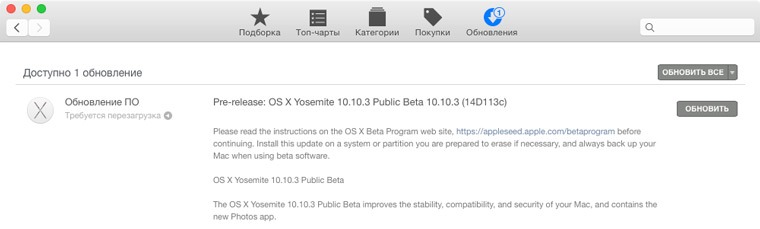 Номер очередной сборки — 14D113C. Она предназначена как для разработчиков, так и для простых пользователей, участвующих в программе публичного бета-тестирования. В обоих случаях обновление можно установить из Mac App Store, а разработчики могут посетить соответствующий портал Apple.