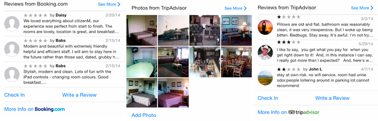 В настоящий момент не существует какой-либо логики в том, откуда карты Apple почерпнут информацию для конкретного отеля или гостиницы. Вы можете увидеть данные с Yelp — это по-прежнему единственный официальный источник подобной информации, а можете увидеть упоминание Booking.com или TripAdvisor. Оба последних сервиса пока никак не упомянуты на сайте компании, но работы над их интеграцией с картами определенно ведутся.