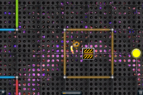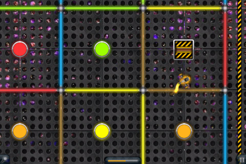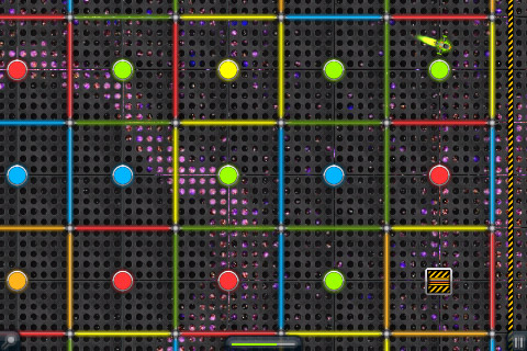 От плохого – к хорошему. В каждом новом уровне мы имеем каким-то цветом окрашенный звездолёт, который может пролетать насквозь лазерные преграды схожего с ним цвета. Например, жёлтый корабль имеет пропуск только через жёлтые барьеры, а натыкаясь на остальные, мы теряем драгоценную энергию, нулевой показатель которой приведёт к крушению и только к нему. Естественно, весь уровень наше транспортное средство жёлтым не будет. Для его перекраски необходимо обратиться в любой из сервисных центров, что отмечены разноцветными кружочками. Поболтались над синим – обрели синий “пропуск”, над зелёным – зелёный.