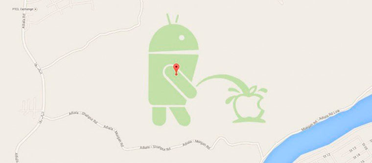Совершенно случайно на картах Google обнаружилось весьма необычное для подобного рода сервисов изображение. На карте Пакистана, в пригороде города Равалпинди появилось изображение логотипа операционной системы Android, справляющего нужду на логотип Apple.