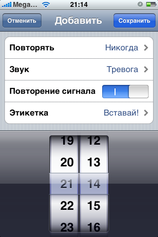 А так-же – самая приятная для меня вещь. Теперь при добавлении нового будильника утром меня будить будет не убаюкивающая Маримба, а та мелодия, которая установлена в предыдующем будильнике! А то меня, иначе как Тревогой, не поднять! Да, к стати, названия мелодий и сигналов переведены на русский.