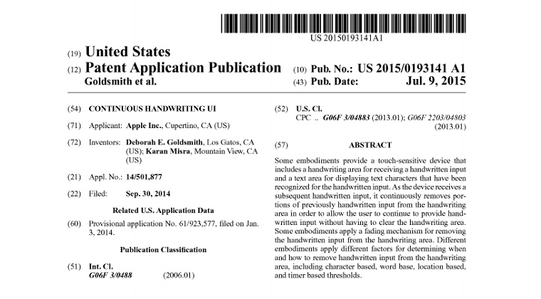 Получивший название «Пользовательский интерфейс непрерывного рукописного ввода» патент окажется очень полезен для бизнесменов и студентов. Суть его заключается в возможности написания текста с тем же удобством, с каким мы привыкли делать это на бумаге. До сих пор сложность заключалась в ограничениях, определяющих время очистки поля для ввода текста и его границы. В Apple разработали подходящее решение.