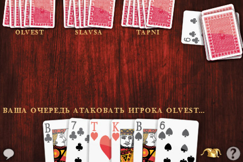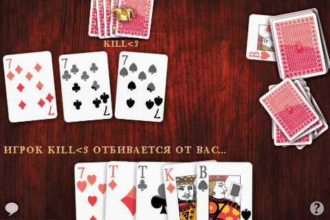 Вернёмся к самому интересному, к многопользовательской игре. Выбор протоколов достаточно широк и может удовлетворить практически любым требованиям – локальные Bluetooth, Wi-Fi и глобальный Internet. Если первые два не совсем понятно зачем существуют (разве что на те случаи когда у вас нет под рукой ни колоды карт, ни десяти рублей на её покупку), всегда приятнее покидать настоящие карты на настоящий стол, то третий поддерживаемый приложением вид связи наверняка нужен, да ещё как. Игра с друзьями и случайными партнёрами в гигантской сети ставит Durak 2.0 на одну ступень с известной всем Charadium, и продолжает развивать это интересное и наверняка сближающее направление сферы мобильных развлечений. Единственный минус – для связи требуется Wi-Fi или 3G, что доступно далеко не всем.