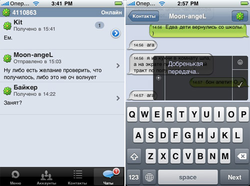 Вот несколько снимков самых основных моментов общения: список контактов, окно чата, окно чата во время набора сообщения и список активных диалогов.