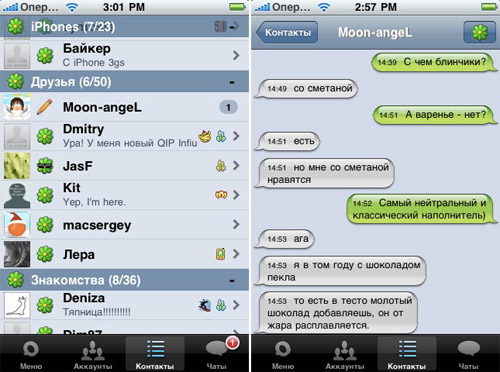 Теперь о главном. Рад сообщить вам о выходе в AppStore своей разработки – мессенджера, который уже сейчас позволяет переписываться в сервисах ICQ, Jabber и Mail.Ru. Имя ему – MobiQ IM.