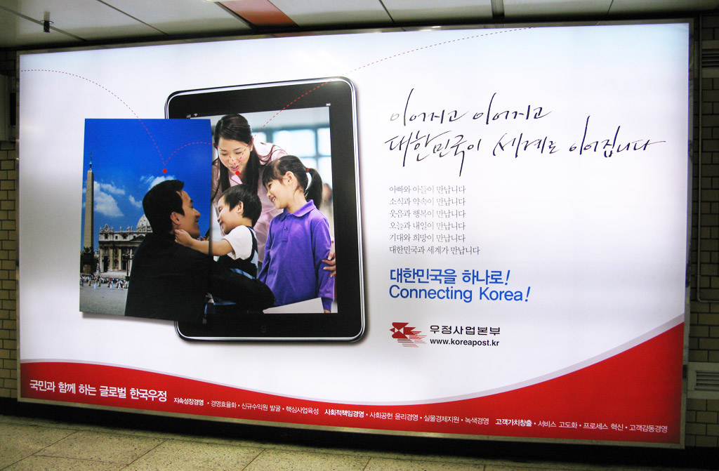 Вернулся сегодня из Сеула и решил поделиться странным фото из тамошнего подземного перехода в самом центре города под City Hall’ом. На картинке изображена счастливая семья вместе, но папан находится в тоже время очень далеко (прим. ред. судя по фотографии, в Вашингтоне). Уровень 3G-сигнала в левом верхнем углу, круглая кнопка внизу, характерная окантовка говорят в пользу iPad.